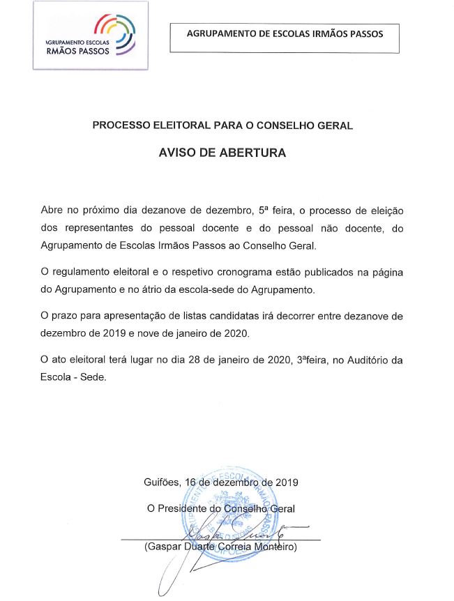 Aviso de Abertura – Processo Eleitoral para o Conselho Geral 16/12/2019 Posted on by Consulte o Regulamento: Regulamento Eleitoral Related posts Aviso aos Encarregados de Educação CONVOCATÓRIA – Assembleia Eleitoral do Pessoal Docente e não Docente Desporto Escolar 2024-2025
