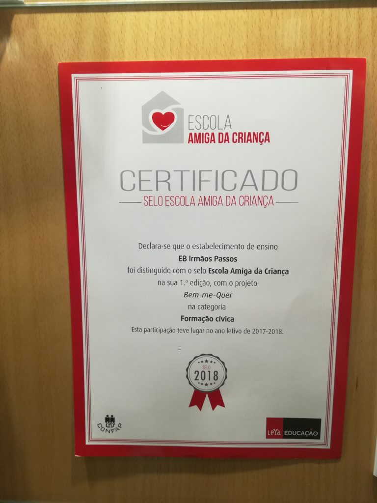 A Escola Básica Irmãos Passos, foi agraciada com o selo Escola Amiga da Criança, na sua 1ª Edição, com o Projeto “Bem Me Quer” na sua categoria Formação Cívica, no ano letivo de 2017/2018.