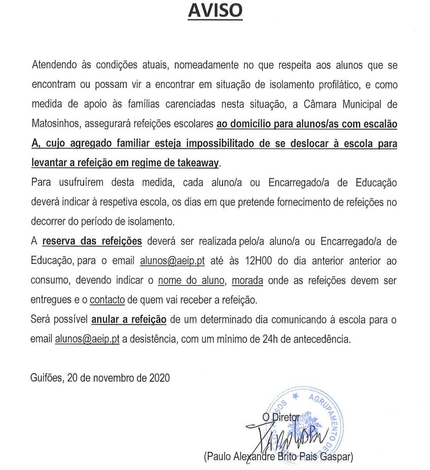 Atendendo às condições atuais, nomeadamente no que respeita aos alunos que se encontram em situação de isolamento profilático, e como medida de apoio às famílias carenciadas, a CMM assegurará refeições escolares ao domicílio aos alunos com Escalão A, cujo agregado familiar esteja impossibilitado de se deslocar à Escola para levantar a refeição em Takeaway.