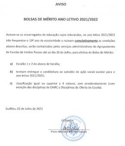 AVISO – Bolsas de Mérito Ano Letivo 2021/2022 Posted on by Consulte o aviso: Related posts Resultados Eleitorais- Conselho Geral (29-01-2020) Cartão Escolar Virtual – refeições escolares JI e EB1 (almoços e merendas) Configuração dos Computadores Escola Digital
