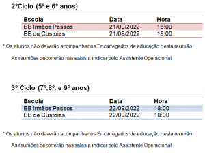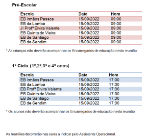Reuniões com os Encarregados de Educação- Pré-Escolar, 1º, 2º e 3º Ciclos Posted on by Consultes o calendário de reuniões: Pré-Escolar e 1º Ciclo (1º,2º,3º e 4º anos) Publica-se o calendário das reuniões a realizar com os Encarregados de Educação: Agradecemos a colaboração de todos. AEIP, 08-09-2022 Related posts Lista de Alunos Colocados 2020-2021 TRILHOS EM FAMÍLIA Torneio Pais e Filhos